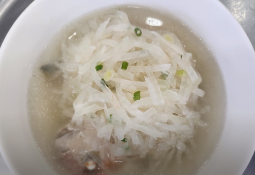 한라식당 제주본점의 옥돔뭇국은 잘게 채 썬 무가 가든 담긴 맑은 국물 속에 옥돔 한 마리가 통째로 들어가 있는 것이 특징이다. 옥돔은 비린내가 거의 없는 고급 어종으로, 무와 함께 푹 끓여내면 국물이 설탕을 넣은 듯 달큰하고 시원하다. 인위적인 조미료 맛이 아닌, 생선 자체의 기름과 무의 단맛이 어우러진 깊은 감칠맛이 일품이다. 살짝 건조된 옥돔을 사용해 살이 단단하면서도 쫄깃하며, 입안에서 부드럽게 풀리는 무의 식감이 대조를 이루는 것도 인상적이다.