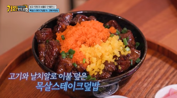 이곳은 압도적인 고기 양과 가성비로 인근 직장인들의 입맛을 사로잡고 있는 곳으로, 주문 즉시 구워내는 고기와 특제 소스의 조화가 좋고, 혼밥하기에도 좋은 환경이라 입소문이 난 집이다. 이곳에서 출연진은 목살스테이크알덮밥, 고등어덮밥, 명란들기름비빔우동을 맛보았다.