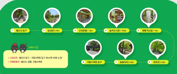 - 경로 : 봉선사입구~능내교~산새관찰~숲속도서관~광릉가능길~포토존~숲속놀이터~국립수목원입구