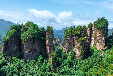 - 원가계: 장가계의 하이라이트라 할 수 있는 원가계는 하늘을 향해 솟아오른 기암괴석과 주변 자연 경관이 어우러져 압도적인 분위기를 자아낸다. 영화 <아바타>의 '할렐루야산'으로 알려진 건곤주가 자리에 있어 마치 신선이 된 듯한 기분을 느낄 수 있다. 특히 높이 335m의 백룡 엘리베이터를 타고 원가계를 오르내리며 스릴을 만끽할 수도 있다.