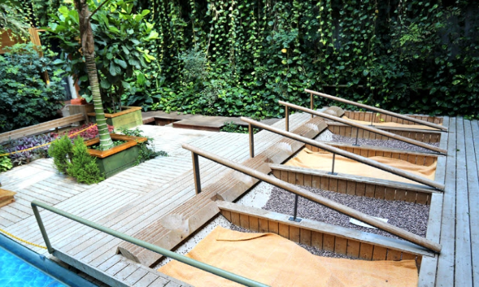 찜질을 마치고는 정원 안에서 푸짐한 채소 식단이 뷔페로 제공되어 숲 속 정원에서 좋은 공기와 따뜻한 찜질을 통한 해독작용과 혈액순환 후 몸에 좋은 채소와 콩고기로 만든 푸짐한 식사를 즐기며 힐링을 할 수 있다. 하루 딱 150명만 예약을 받기 때문에 비교적 한적하게 자신의 체질에 맞는 찜질 테라피를 이용하며 휴식을 취할 수 있다는 점이 장점이다.