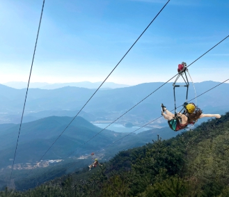 지리산 스카이런은 해발 568m에서 시작하여 내려오는데 짚라인으로 경사율이 국내에서 가장 심하고 길이도 1,086m여서 속도가 빨라 짜릿한 스피드를 경험할 수 있다는 점에서 스릴을 즐기는 여행자에게 제격이다.
