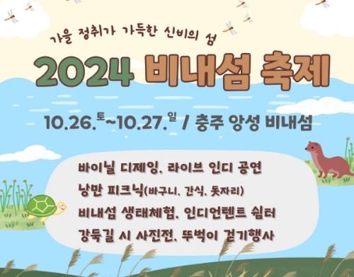 올해 비내섬 축제는 10월 26일부터 이틀간 개최되며 다양한 거리 공연과 생태 체험 프로그램이 진행될 예정이다. 이 지역에서는 충주 비내섬 축제뿐만 아니라 충주의 수안보 온천과 악어봉 같은 관광 명소 방문은 물론 하늘재 걷기 행사 등도 참여해 볼 만하다.